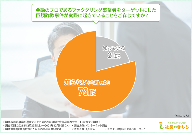 そこで、「金融のプロであるファクタリング事業者をターゲットにした巨額詐欺事件が実際に起きていることをご存じですか?」と質問したところ、『知っている(21.0%)』『知らない(今知った)(79.0%)』という結果となり、8割近くという非常に多くの経営者が、ファクタリング事業者でさえ詐欺被害に遭っているという現実をご存じないことが分かりました。