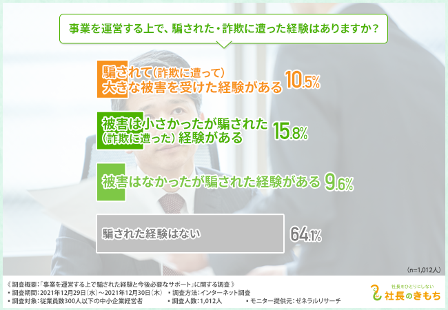 事業を運営する上ではさまざまな困難や課題にぶつかるものですが、実際に騙されてしまった経験のある中小企業経営者はどれくらいいるのでしょうか。