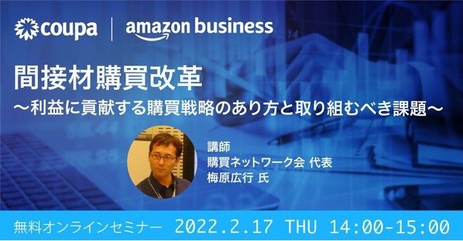 本セミナーでは、全国770社、1600名以上の購買・調達関係者が会員登録している購買ネットワーク会の代表 梅原 広行氏にご登壇いただき、会社の全支出における間接材の意義、多くの企業が抱える課題点とその解決方法をご講演いただきます。また、Coupa株式会社の提供するBusiness Spend Management (ビジネス・スペンド・マネジメント、以下BSM)ソリューション「Coupa」、アマゾンジャパン合同会社が提供する「Amazonビジネス」、それぞれのサービスについてもご紹介します。貴社の業務改善、改革にお役立ていただける内容となっておりますのでぜひご参加ください。