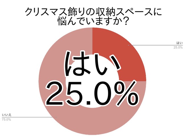 毎年ある程度定位置に収納しているであろうクリスマス飾りですが、アンケートではその収納の仕方に悩みがある人は25%を占めました。つまり、4人に1人がクリスマス飾りの収納について満足できていないことがわかります。