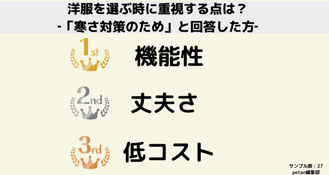 1位はもちろん「機能性」。次いで「丈夫さ」「低コスト」とワンシーズンしっかり使い込める丈夫さがランクイン。「かわいさ」を求める方も少数いましたが。求めてい無い方が大半ということがわかりました。