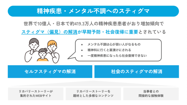 自殺対策・自殺予防にはメンタルヘルスについて正しい理解を広めることや、偏見や差別(スティグマ)を解消するため辛い経験や精神疾患を経験した方と関わる機会を広めることが重要です。精神疾患に対するスティグマの解消には、「正しい知識の教育」と「当事者との接触体験」が有効だとCorrigan PW氏らの「Challenging the public stigma of mental illness: a meta-analysis of outcome studies.」で報告されています。