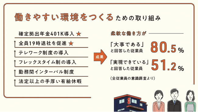 スリーハイは労働集約型である製造業ですが、一部の職種ではテレワーク制度やフレックスタイム制を導入しています。それにより、柔軟な働き方が実現できていると回答した従業員は51.2%という結果がでました。