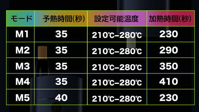 以下の5つのヒーティングモードで、加熱時間を選ぶことができます。