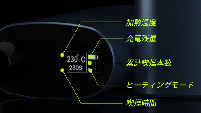 ・デジタルスクリーンで加熱温度、残り喫煙時間、充電残量、累計喫煙本数を管理