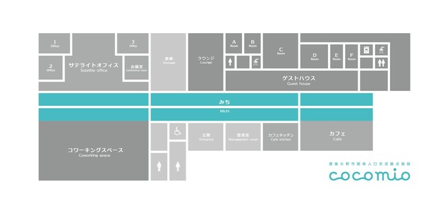 2022年11月にオープンした施設は「ここ(coco)から個々(coco)が共(co-)にコミュニケーション(communication)を取り合い、新たなコミュニティ(community)をつくっていく場所」というイメージに、井路に象徴される緒方町の水の豊かさを連想させる「澪・水脈」(mio)を掛け合わせて「cocomio」と名付けられました。