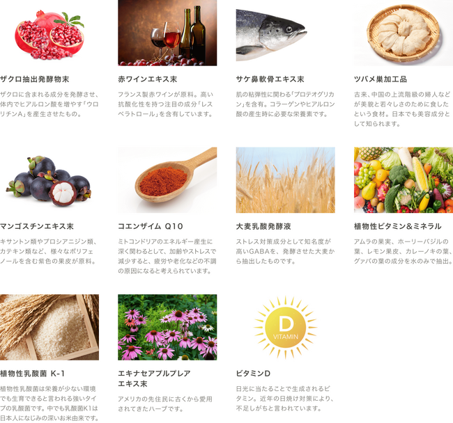 美容や健康をサポートする成分として、他製品では主要な成分として単独で用いられており、かつNMNとも親和性があるものを配合しました。