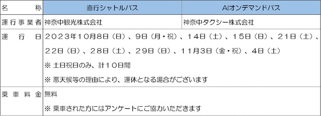 神奈川中央交通株式会社(本社:神奈川県平塚市、代表者:取締役社長 今井 雅之)は、2023年10月8日(日)より、神奈川県からの委託を受けて、宮ヶ瀬湖周辺地域における地域公共交通実証実験を開始します。