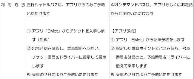 直行シャトルバスとAIオンデマンドバスの運行概要は、下記のとおりです。
