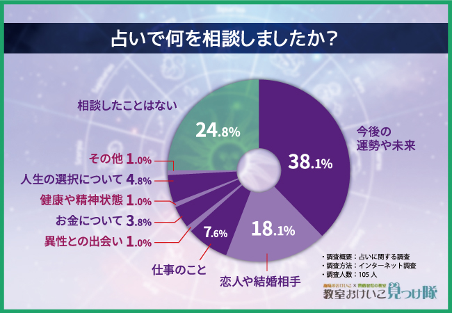 『今後の運勢や未来』と回答した方が38.1%、『相談したことはない』方が24.8%、『恋人や結婚相手』が18.1%、『仕事のこと』が7.6%、『人生の選択について』が4.8%、『お金について』が3.8%、『異性との出会い』、『健康や精神状態』と『その他』がそれぞれ1.0%という結果になりました。