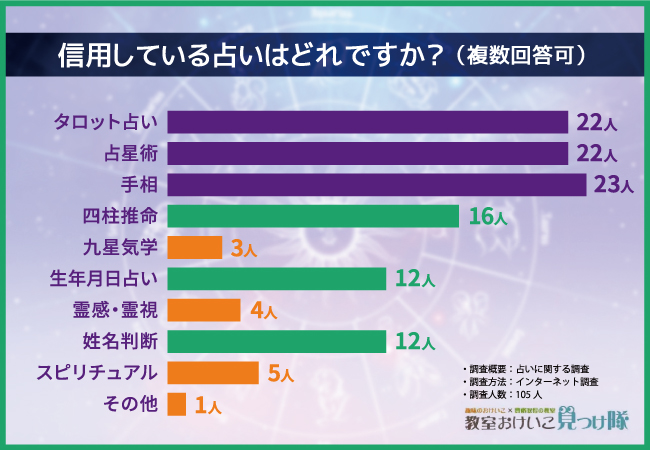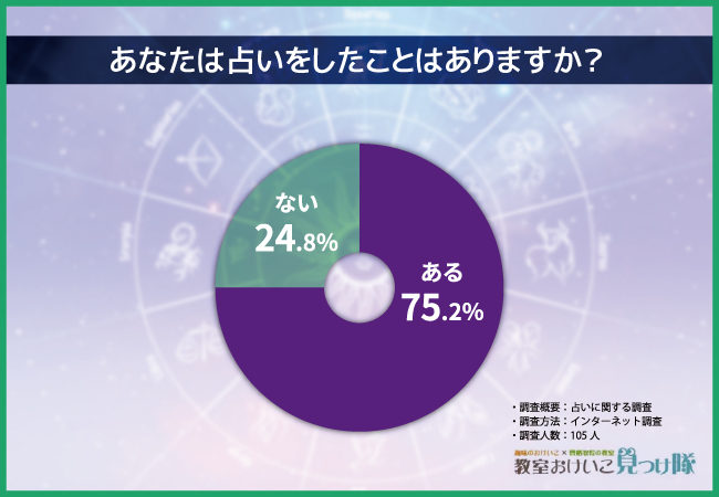 そこで今回、通信教育講座『教室おけいこ見つけ隊』(https://www.pchoice.com/)を運営する株式会社Naneaは、全国の男女105名を対象に「占い」に関するアンケートを実施しました。