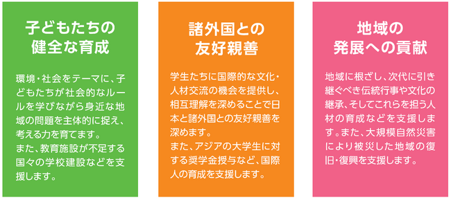 イオンワンパーセントクラブは、「お客さまを原点に平和を追求し、人間を尊重し、地域社会に貢献する」というイオングループの基本理念を具体的な行動に移し、社会的責任を果たすことを目的に、グループ各社の参画のもと、1990年に設立されました。以来30年以上にわたり、お客さまにイオングループをご利用いただき、生まれた利益の1%相当額をもとに、「子どもたちの健全な育成」「諸外国との友好親善」「地域の発展への貢献」を柱に、環境・社会貢献活動に取り組んでいます。