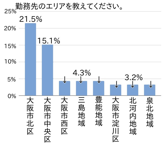 今回のアンケートでは、大阪府にお勤めの方を対象にアンケートを行いました。まずは、回答者の勤務先がどのエリアにあるのかを尋ね、多かった地域をグラフにまとめました。