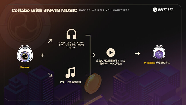 自分が推しているミュージシャンのオリジナルヘッドフォンで、コラボレーションをする楽曲が聴けるこの機能により、本アプリを通じてファンとミュージシャンの関係を強化、また日本の楽曲を世界のユーザへ配信することが狙いです。