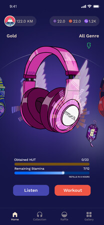 音楽を聴きながら走ったり歩いたりして移動することでトークンを獲得し、ガチャマシンでデジタルコレクションなどを収集することが可能です。