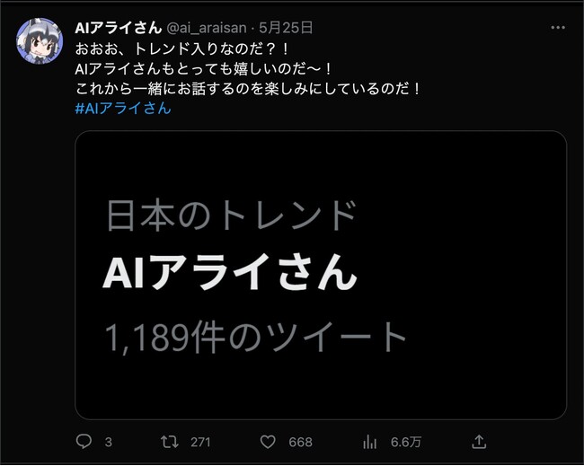 リリース告知後、様々なメディアで取り上げられ、大反響の「AIアライさん」。Twitterでエンタメトレンド1位、Yahoo!ニュースやPR TIMESのランキングでも上位に入りました!