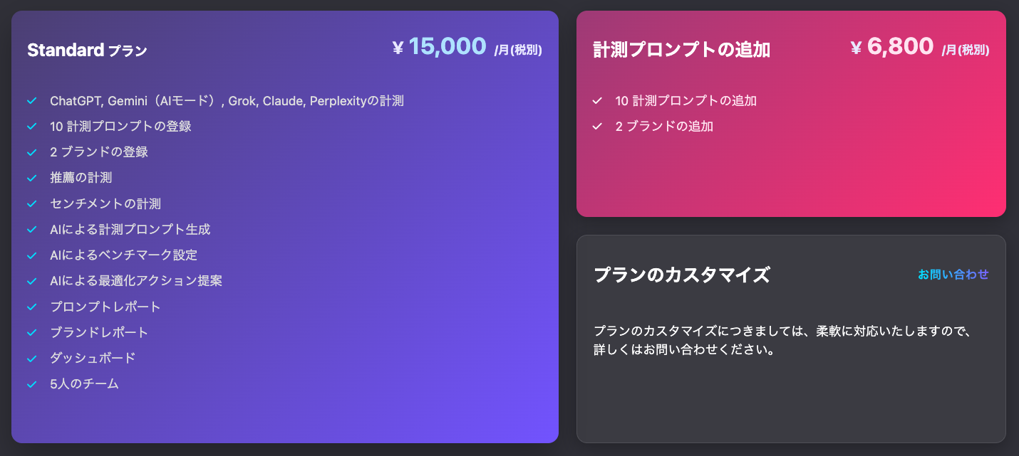 これまで分かれていたLiteプランおよびBusinessプランを統合し、月額15,000円(税別)で5大生成AI(ChatGPT、Gemini、Grok、Claude、Perplexity)を横断計測できる国内でも稀有な価格設計です。
