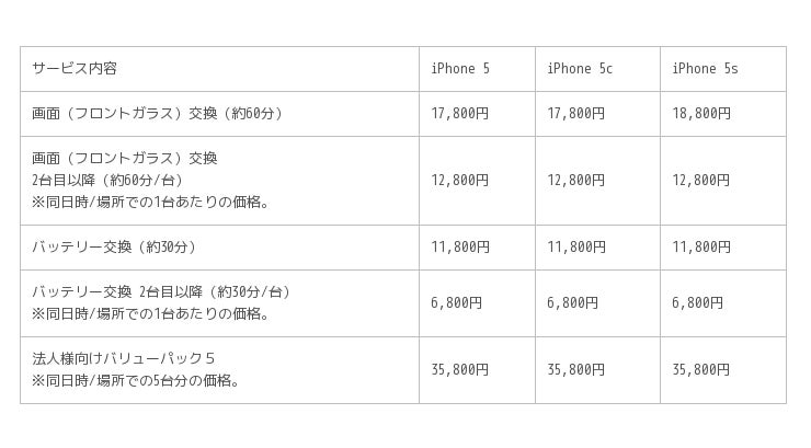 サービス開始時は、iPhone 5、iPhone 5c、iPhone 5sの画面(フロントガラス)交換とバッテリーの交換をサービス対象とし、サービスエリアは東京23区から開始いたします。今後、順次サービス内容の拡充、サービスエリアの拡大を図ってまいります。