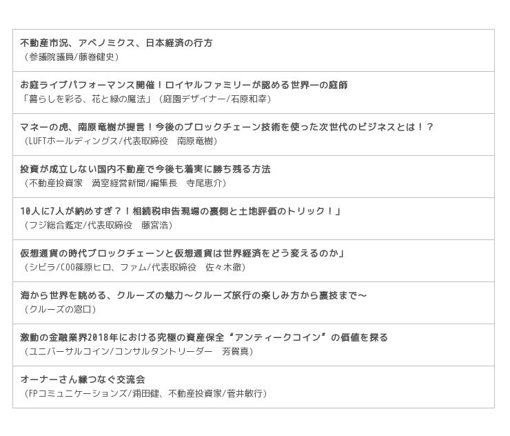 本イベントは、賃貸物件を所有している不動産オーナーと投資家が3,000人以上来場するビッグイベントです。資産運用だけが投資ではありません。家族の健康も、居心地のいい住居も、新しい知識を得ることも、すべてを人生への投資ととらえ、一人ひとりが実りある時間を過ごしていただけるよう企業ブースやセミナー、体験コーナーなど心躍る仕掛けをご用意しております。
