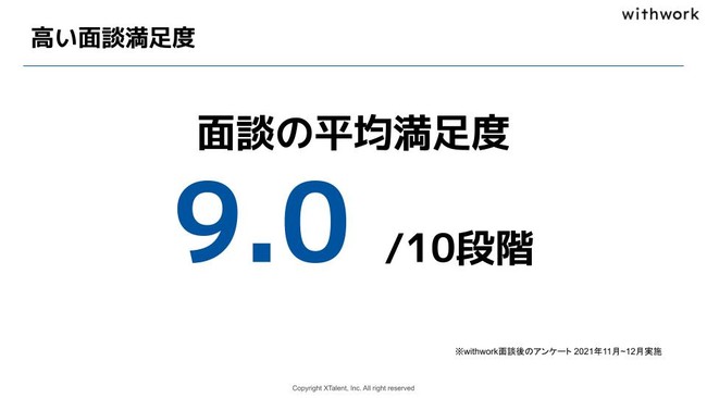 withworkではご登録後にコンサルタントと面談を実施しています。面談では求人をご提案するだけでなく、一人一人のユーザー様の人生に寄り添うヒアリングを心がけ、キャリアの棚卸しや思考の整理を行います。おかげさまで満足度は10段階中 平均9.0と非常に高く、ご好評の声も多数いただいています。