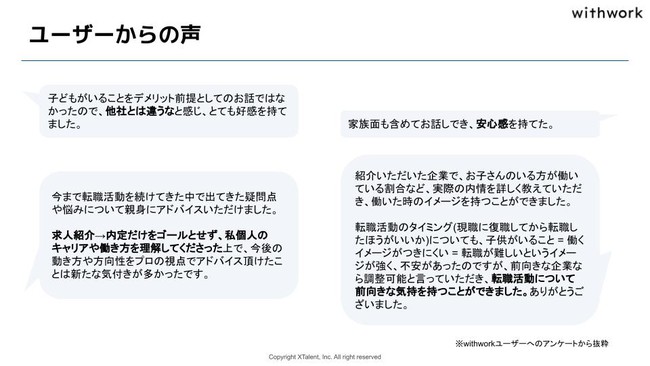withworkでは2022年もワーキングペアレンツの転職をご支援していくとともに、ユーザーの転職ストーリーやDE&Iに取り組む企業様の事例をお伝えするオウンドメディアの立ち上げ、キャリアに悩むワーキングペアレンツに向けたイベント開催など、幅広い活動を展開して参ります。