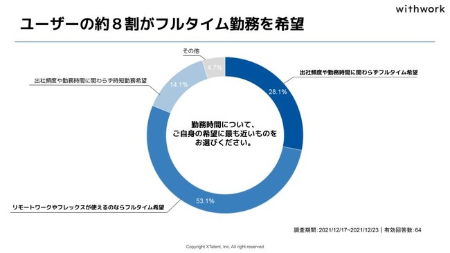 新型コロナウィルスの感染防止策として2020年よりリモートワークや時差出勤など柔軟な働き方が都心部を中心に実施されてきましたが、感染者数減少をきっかけに全社出勤を再開するなどの動きが各企業で見られ始めました。XTalent株式会社(本社:東京都港区 代表取締役:上原達也)が運営する、ワーキングペアレンツのための転職サービス『withwork(ウィズワーク)』では、LINE登録ユーザーが4,500人を突破した記念として、登録ユーザーを対象とした「ワーキングペアレンツの転職動向調査(2021)」を実施。(調査期間:2021年12月17日〜12月23日)。持続可能な働き方を望む、ワーキングペアレンツが職場に求めているものが調査を通して明らかになりました。