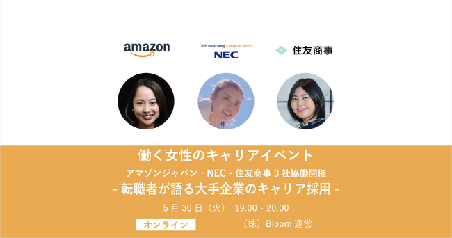 株式会社Bloom(本社所在地:東京都渋谷区、代表取締役:平原 俊幸)は、「働く女性のキャリアイベント アマゾンジャパン・NEC・住友商事 3社協働開催 -転職者が語る大手企業のキャリア採用-」を2023年5月30日(火)に開催します。
