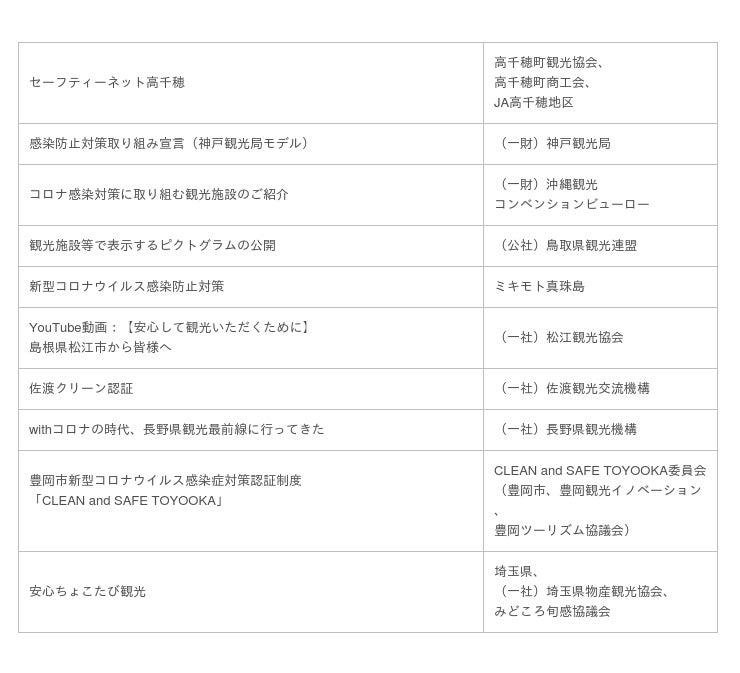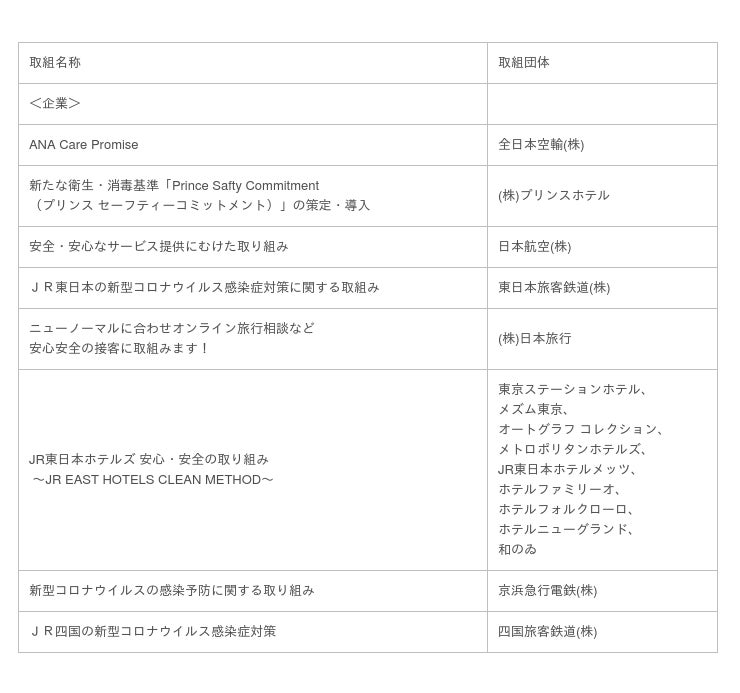 旅行者の皆様には、旅に関わる全員が安心で楽しい旅行となるよう「新しい旅のエチケット」等へのご理解とご協力を改めてよろしくお願いいたします。また、観光関係者の皆様には、引き続き各所での取組の共有などにご協力をお願いいたします。当協会では、引き続き感染症対策の啓発に努めるとともに、旅の安全・安心に向けた情報の発信を強化してまいります。