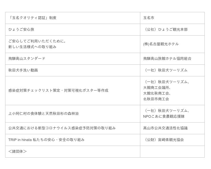 今回は、東京に関連した3つの事例を紹介しましたが、旅の安全・安心を確保するための取組を紹介するサイトでは、別紙1の通り38団体40取組について詳しく紹介しています(http://www.nihon-kankou.or.jp/home/tabinoanshin/)ので、あわせてご覧ください。