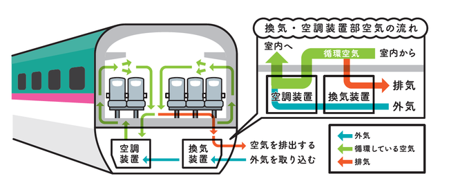 ・新幹線や在来線特急車両については、空調装置や換気装置により、6〜8分程度で車内の空気を入れ替えています。
