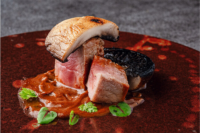 20種類程の材料で作るマッシュルームのスパイスステーキソースを、じっくりと焼き上げたジャンボマッシュルームと豚ヒレ肉に合わせました。スパイスの効いたステーキソースとマッシュルームのうま味が相性抜群です。