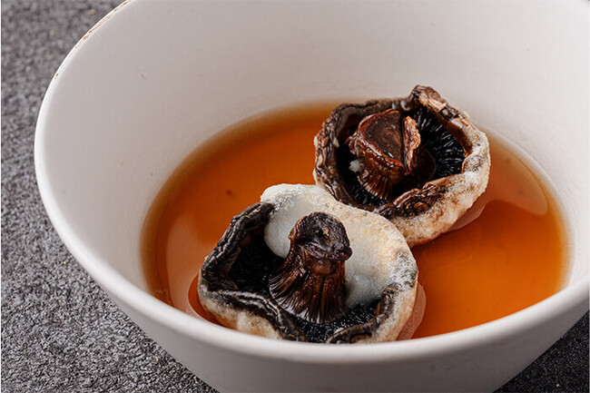 低温でじっくりとセミドライにしたマッシュルームに米粉をまとわせ、フリットに。さらにマッシュルームでひいたお出汁の餡を掛けて。セミドライならではの、噛むほどにうま味が口内にじわじわと溢れる美味しさの体験は、他では絶対味わうことができないマッシュルーム料理専門店ならではの逸品です。