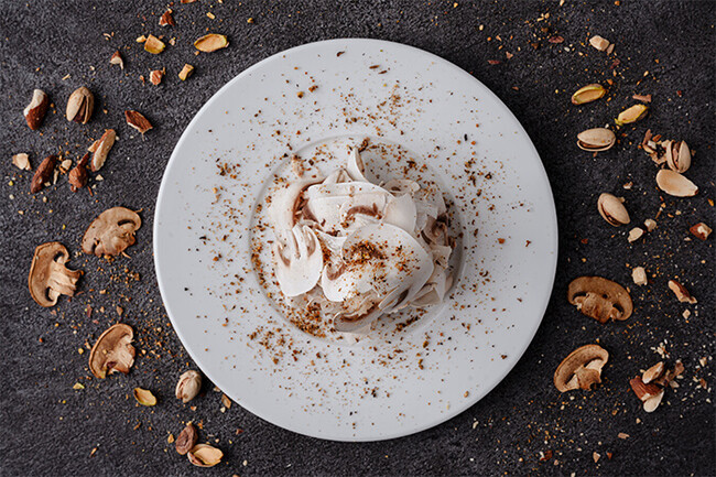マッシュルームに見立てた独特の盛り付けのシルエットにもご注目。