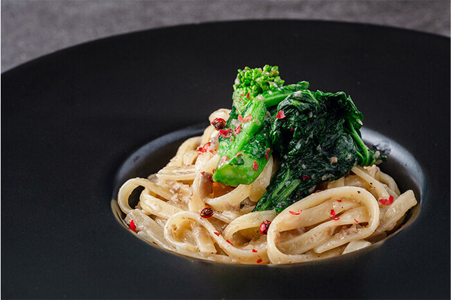 旬の菜の花を、マッシュルームをふんだんに使用した自家製のデュクセルソースと合わせたオイルパスタです。