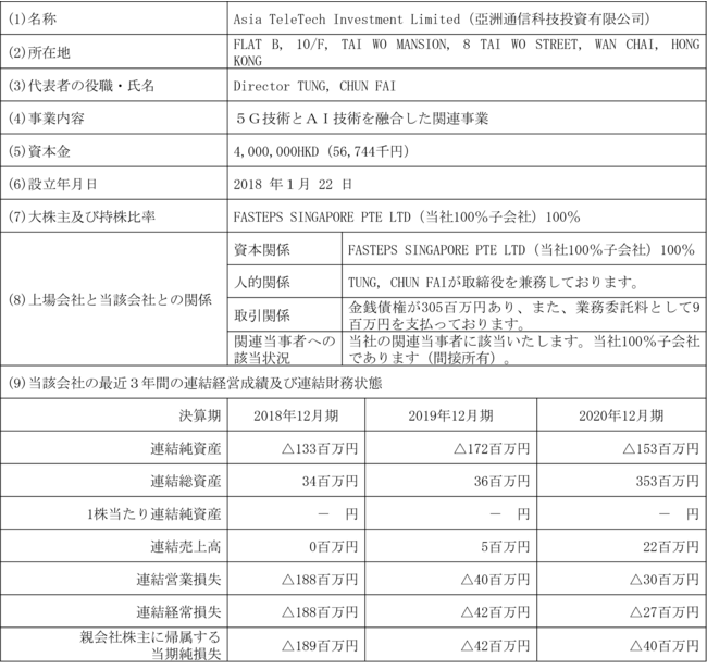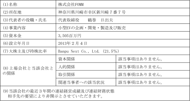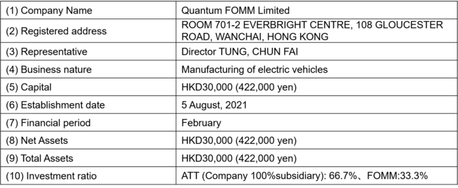 本資本・業務提携では、当社グループがFOMM社に対して出資する予定ですが、FOMM社との協議等の結果、それに加えて中国におけるEV(電気自動車)の生産体制及び販売体制の構築・整備をより迅速に行うため、当社グループとFOMM社との間で、香港に合弁会社を設立(商号:Quantum FOMM Limited、以下「新会社」という。)することで合意し、新会社を中心として、中国国内での、EV生産体制及び販売体制の構築・整備を行っていくことといたしました。新会社への出資は、当社グループとしては、当社の100%子会社であるAsia TeleTech Investment Limited(以下「ATT」という。)から直接行う予定であり、FOMM社側からは、FOMM社本体から行う予定です。