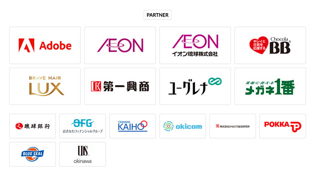 <協賛>アドビ株式会社/イオン株式会社/イオン琉球株式会社/チョコラBB/LUX/株式会社第一興商/株式会社ユーグレナ/株式会社メガネ一番/株式会社琉球銀行/株式会社沖縄ファイナンシャルグループ/株式会社沖縄海邦銀行/株式会社okicom/株式会社かねひで総合研究所