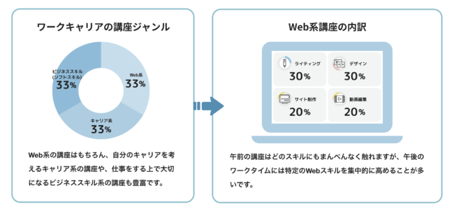 ワークキャリアの講座は1ヶ月を通して今後の進路を考えるキャリア系講座、スキルを身につけるWeb系の講座、身につけたスキルを実践の場で活用するためのビジネススキル(ソフトスキル)系講座が実施されます。また、ビジネススキル(ソフトスキル)系の講座では、グループワークを取り入れることで学んだことをその場でアウトプットすることを重視しています。