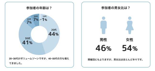 ワークキャリア卒業生の参加者の年齢層1位は20代(44%)、2位は30代(41%)
