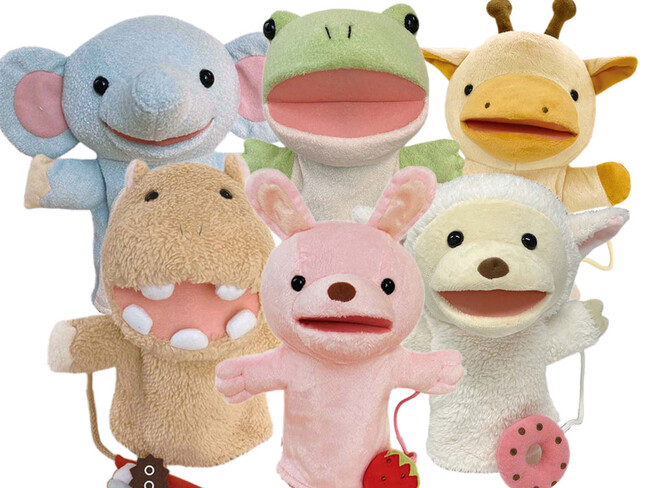 ウサギやヒツジ、カバなどカラフルで可愛い動物のパペットは、贈り物としてもおすすめ