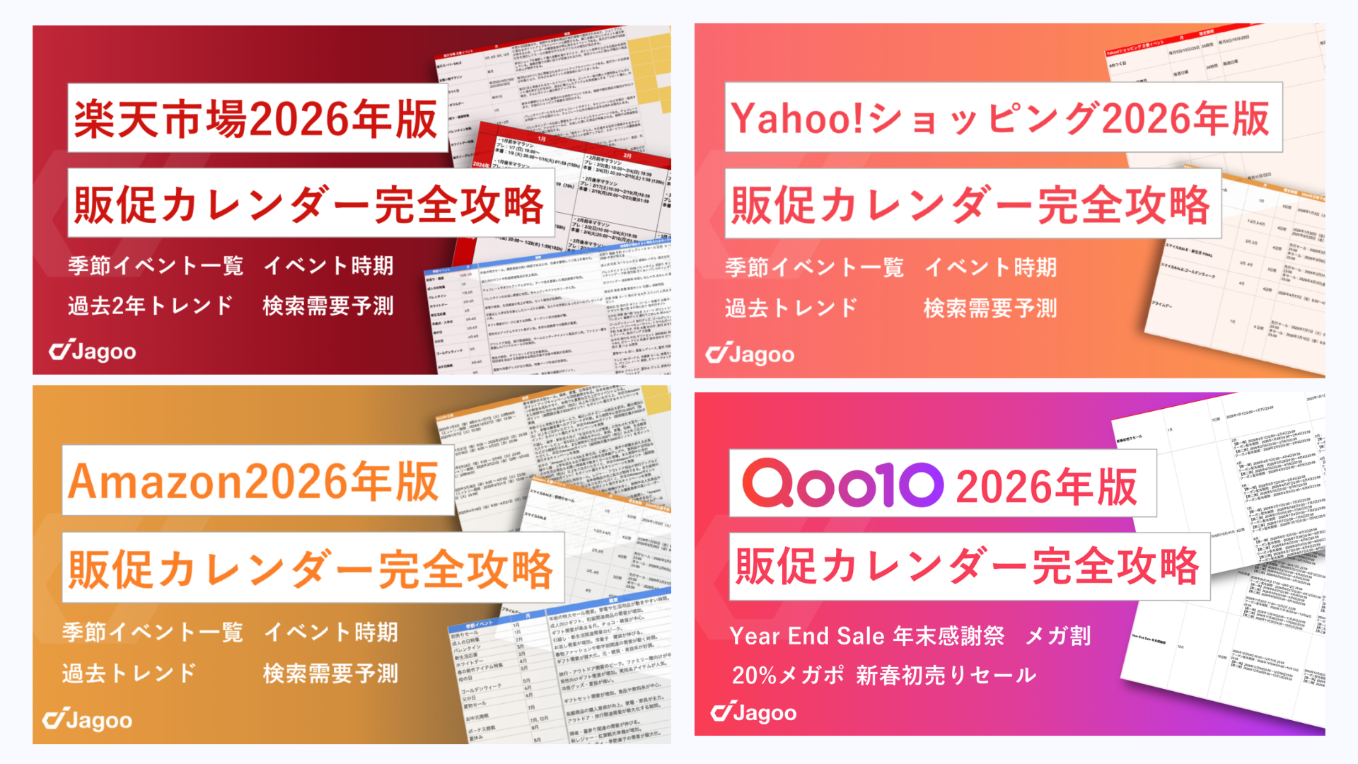ジャグーが支援してきた企業においても、イベント開催前の準備を念入りに行っている企業ほど、安定して売上を伸ばしている傾向が見られます。こうした背景から、モールごとに「いつ・何が起きるか」と「その月に伸びやすい検索需要」を一つに整理し、担当者が迷わず販促設計に着手できる実務資料として、2026年度版の販促カレンダー4種を作成・公開しました。