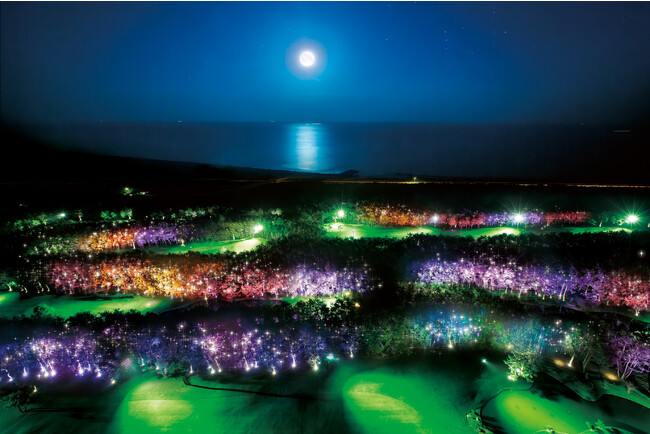 広大なゴルフコースを舞台に繰り広げられる黒松林のイルミネーションは、人の呼吸や鼓動のリズムに合わせてオーロラのような揺らめきを見せます。1670万もの多彩な色合いを表現する電飾が松林中にふんだんに散りばめられ、昼間の青々とした松林をまるで別世界のように塗り替えています。