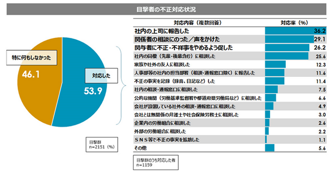 6. 不正目撃者の53.9%が不正に対して何らかの対応を行い、「特に何もしなかった」が46.1%。対応内容としては、「社内の上司に報告した」が36.2%で最多。