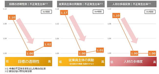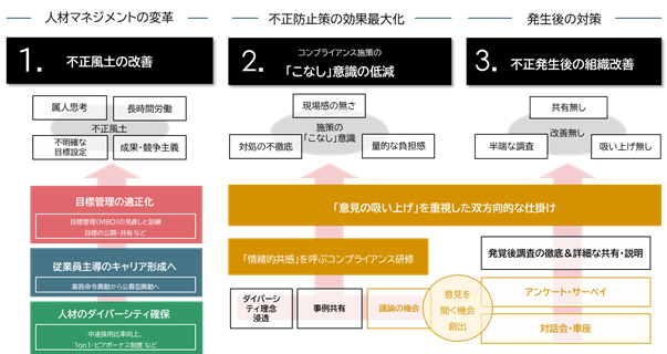 今回の調査から示唆された不正防止のためのポイントは、まず目標管理の適正化やキャリア形成の整備によって、組織全体の不正風土の改善を図ること。また、一方通行的な説明だけでなく、議論やワークショップ、サーベイなど、従業員側の「意見の吸い上げ」を重視したコンプライアンス対策の重要性だ。