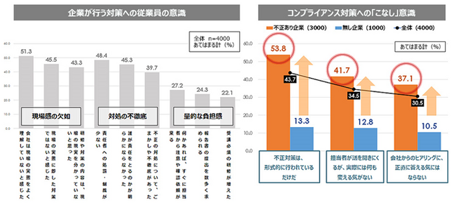 しかし、企業がコンプライアンス対策として様々な施策を行っていても、大量の手続きや現場感の無い研修などは、対策を形式的に「こなす」意識を生み、不正防止につながっていないことが明らかになった。