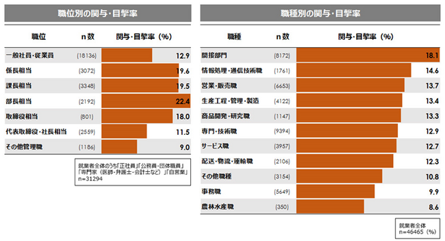 2.職位別では「部長相当」の関与・目撃経験が22.4%で最も高く、職種では「間接部門」の関与・目撃率が最も高い。