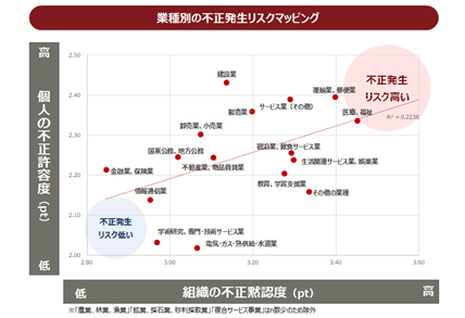 不正発生リスクを業種別にみると「運輸業、郵便業」「医療、福祉」が高い結果に(個人の不正許容度※/組織の