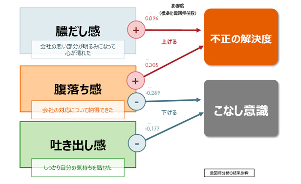 7. 従業員の「膿だし感(会社の悪い部分が明るみになって心が晴れた)」「腹落ち感(会社の対応について納得できた)」は、不正の解決度とプラスの関係が見られた。また、「腹落ち感」「吐き出し感(しっかり自分の気持ちを話せた)」があることが、こなし意識とマイナスの関係が見られた。