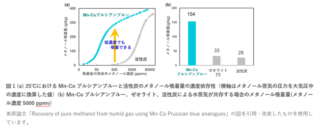 今回の技術では、プルシアンブルー類似体のうち、マンガン(Mn)とコバルト(Co)がシアノ基で架橋されたMn[Co(CN)6]2/3(以下、Mn-Coプルシアンブルー)が、水蒸気を含む大気中の希薄な気体のメタノールを吸着することを発見しました。
