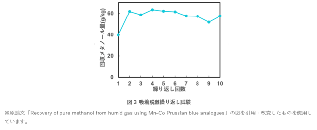 さらに、Mn-Coプルシアンブルーに対して吸着と脱離を繰り返す試験を10回行いました。その結果、回収できるメタノール量に変化は見られず、繰り返し使用しても劣化しない安定な吸着材であることが分かりました(図3)。
