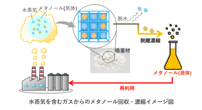 カーボンニュートラル社会の実現を目指すうえで、二酸化炭素を還元したメタノールの利用が期待されています。メタノールの合成過程で副産物として水が生成するため、水を除去しメタノールだけを吸着して高濃度化する本技術の活用を検討します。